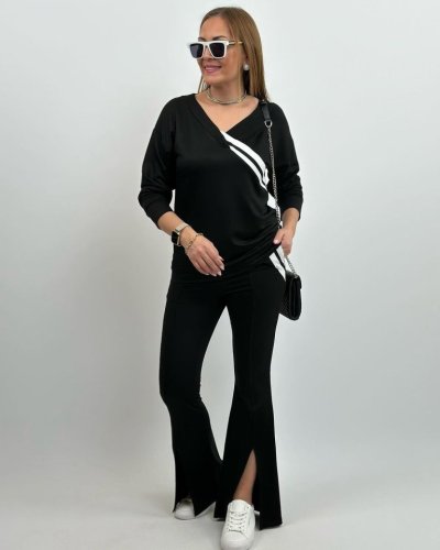 • Kadın uzun kollu v yakalı şerit detaylı viskon iki iplik bluz ve pantolon ikili takım